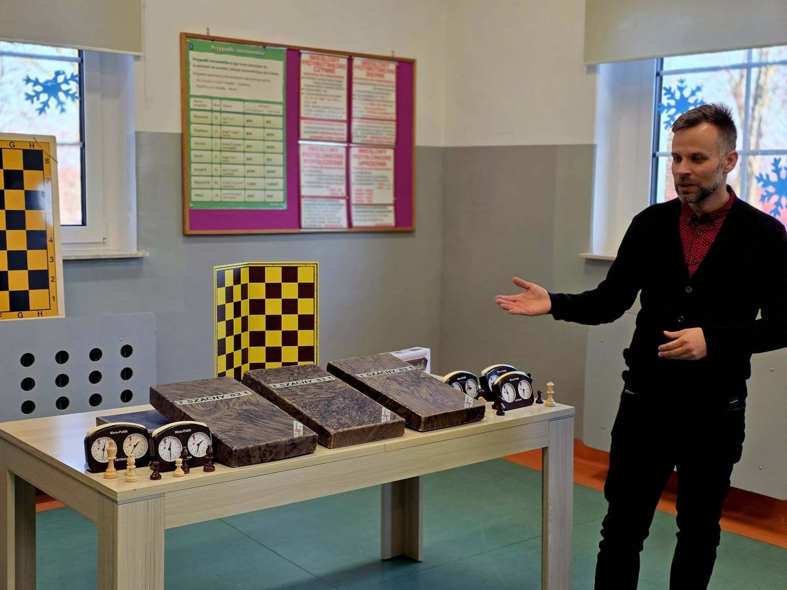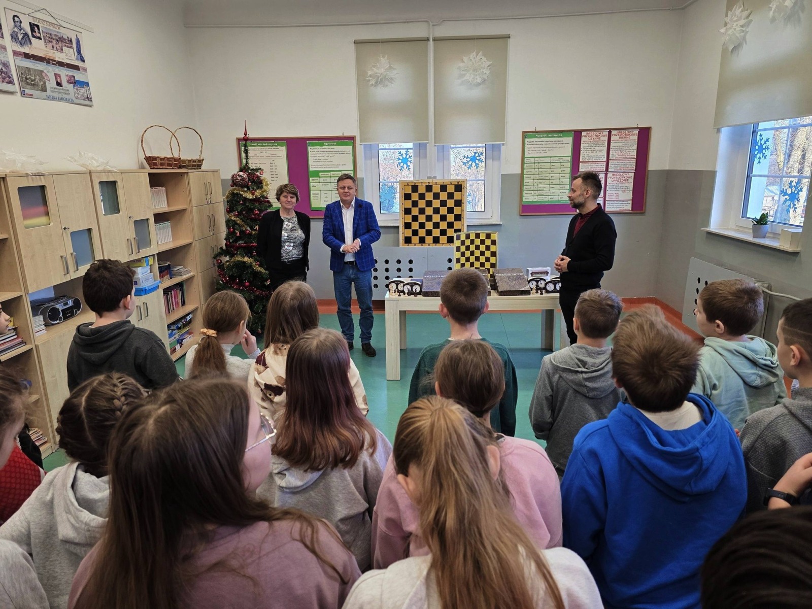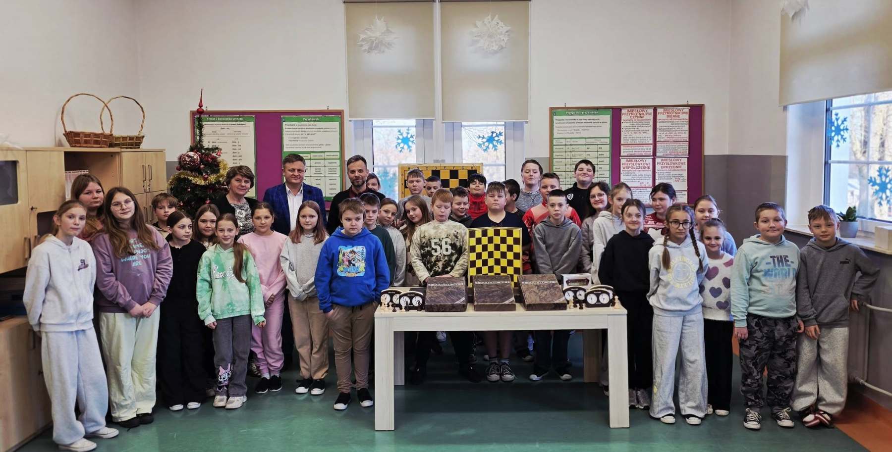 👨‍🏫♟️ Uczniowie pod bacznym okiem Pana Pawła Lemiesiewicza oraz przy wsparciu 🤝 Prezesa Klubu „Skoczek” – Pana Andrzeja Gniadka – rozpoczynają swoją przygodę z grą w szachy ♞.
